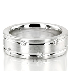 Simplicity shines! This 7mm wide diamond wedding band set has a flat satin finish profile and two parallel diamond-cuts all around, with evenly spaced symmetrical diamonds on both cuts. Each stone weighs 0.03 ct for a total of 0.36 ct per ring. The diamonds are graded G in color and SI1 in clarity, offering exceptional brilliance.