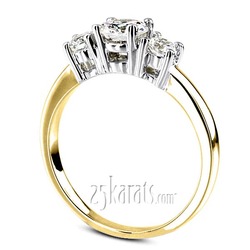 You can never go wrong with this classic style three stone engagement ring. It is true symbol of the past, the present and the future. Hand selected brilliant diamonds set in to this classic three stone ring. This classic three stone ring features 1.00ct. tw. GH SI diamonds. Side diamonds are 0.25ct each and center diamond is 0.50ct.