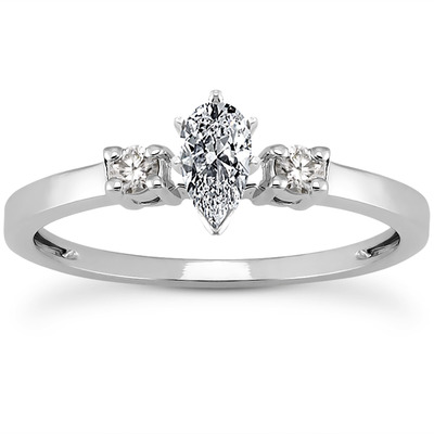 Attractive! This lovely three stone diamond bridal ring features round cut side stones with basket setting totaling 0.10 ct. This diamond engagement ring can be purchased as a set and it is available in white gold, yellow gold and platinum..