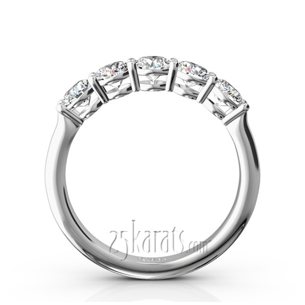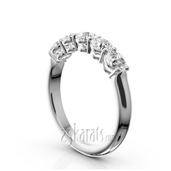 Classic anniversary band is re-designed for your comfort. Rounded shank is finished as comfort fit. This basket setting shared prong wedding band is furnished with 1 ct.tw diamonds. It is available in 14K, 18K white, yellow or rose gold and platinum.