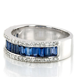 Faceted baguette cut sapphires are accented with round brilliant diamonds. This solid anniversary ring is furnished with 21 pieces 3x1.5mm straight baguette blue sapphires and GH-VS round diamonds. This gorgeous wedding band is available in 14k, 18k, platinum and palladium.