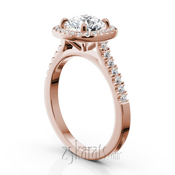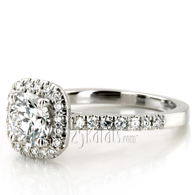 A dazzling cathedral halo ring! Your choice of round center stone will be accented with 1/3 ct. t.w. brilliant side diamonds. Cushion shaped halo provides an alluring frame for the center stone. This ring is available in 14k, 18k, platinum and palladium.