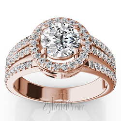 This three way split halo engagement ring will be the first step to delightful memories. This micro pave set engagement ring features 3/4 ct. t.w. side diamonds to bring all the brilliance of your choice of center stone. This ring is available in 14k, 18k gold and platinum..
