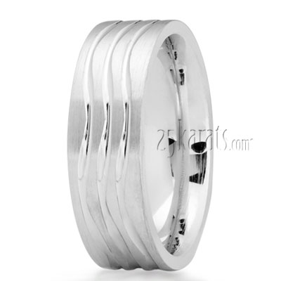 Stylish! This 7mm wide Flat wedding ring has three rows of bright cut waves all around. The band is satin finished.