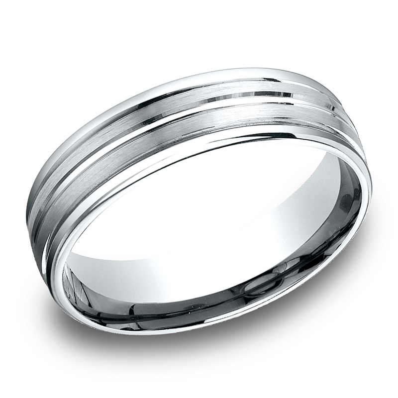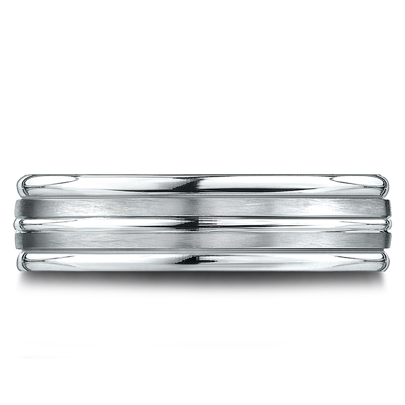 This incredible Benchmark 14 karat 6.5mm comfort-fit satin-finished carved design band features a with a high polished a high polished round edge and center trim that give subtle consistency of style and form. Thickness is approximately 1.4mm.