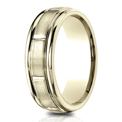 This Benchmark 14 karat 6.5mm comfort-fit satin-finished carved design band features a beautiful high polished round edge along with 8 polished vertical grooves along the center. Thickness is approximately 1.4mm.