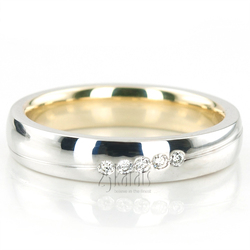 Trendy and out of ordinary newly designed wedding band ring. Two tone dome comfort fit band diamond carved shinny line is symbolizing the infinite journey. This 4mm wide diamond wedding band has round shaped diamonds with a burnish setting. The ring is set with 5 Round Cut Diamonds. Each diamond weights 0.01ct, which is a total of 0.05ct. The diamonds are graded G in color and SI1 in clarity. Bright cut diamonds are symbolizing the divine light shinning on their journey. Band is build with yellow gold inside and white gold on top, but also can be build other combinations, simply let us know what combination is your pick.