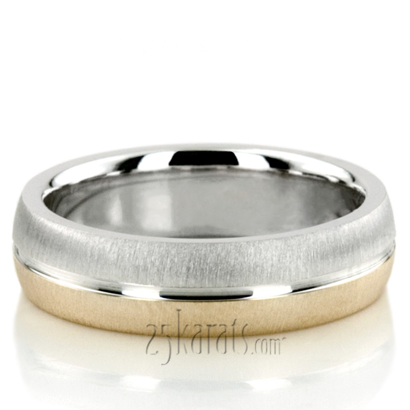 This 5mm Two-tone wedding ring is a simple and yet elegant style. It has a bright cut in the center dividing the band into two equal pieces; half White gold, half Yellow Gold.