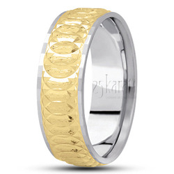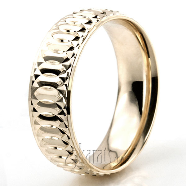 This exquisite 7mm wide diamond cut wedding ring features an intricate pattern of intersecting circles encircling the band, with angular cut edges. The center showcases a stunning stone finish accented with numerous bright cuts, while the high polished sides enhance its brilliant appearance. Available in widths of 5, 6, 8, 9, and 10mm, this ring offers a perfect blend of sophistication and style.