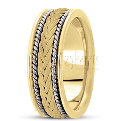 This hand-braided wedding ring features a bold design with a wide center braid and two ropes on each side. The center braid is satin finished while the small braids and edges are high polished, creating a beautiful contrast. The ring is complete with shiny edges, enhancing its elegant and sophisticated look. This wedding band is available in various widths, offering a customizable option to suit your personal style.