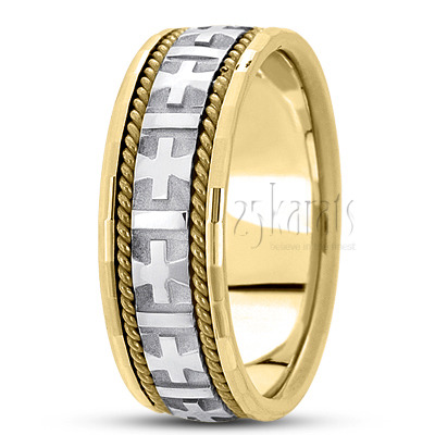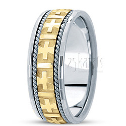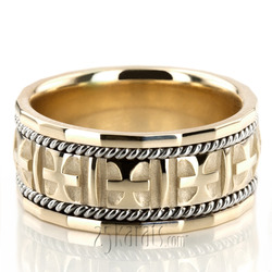 A bestseller! This 8mm wide Religious Handmade wedding band has lovely cross motifs, separated by vertical cuts, at the center. There are small braids on each side of the center piece, and edges are angular-cut. This wedding band is also available in 7, 9, 10mm.