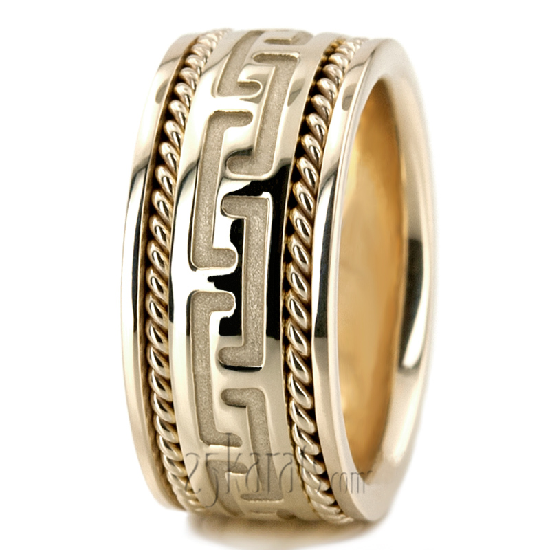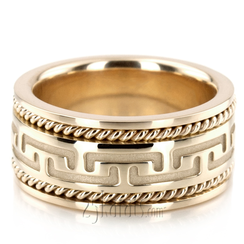 This contemporary 8.5mm wide Handcrafted wedding band has symmetrical wide U-shaped cuts all around at the center, and small braids on each side. This wedding band is also available in 7.5, 9.5, 10.5mm.