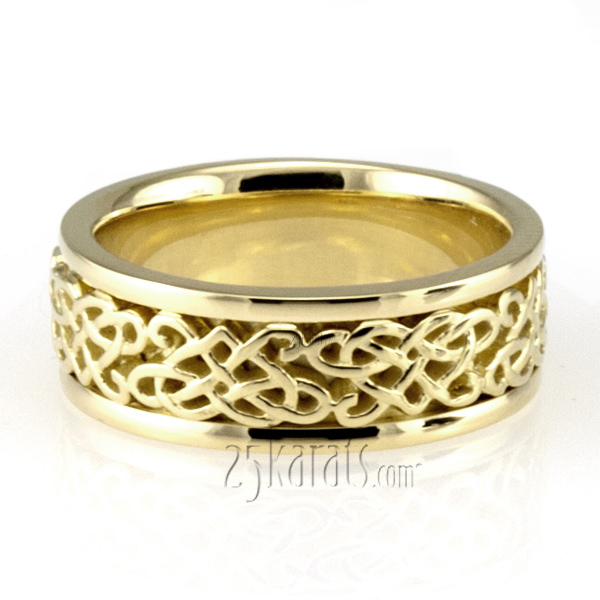 A gorgeous style, this Celtic wedding band has elaborate Celtic hearts all around. It's complete with shiny edges. This wedding band is available in 6, 7, 8, 9, 10mm, and Two Color Gold.