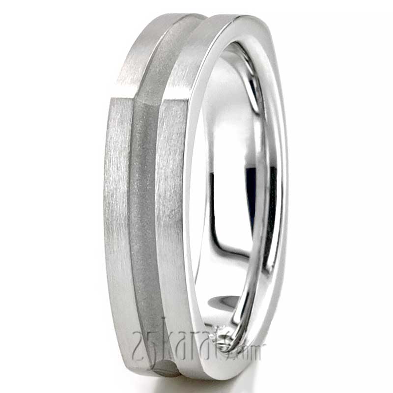 A beautiful design, this 5mm wide Four-sided wedding band has a shiny body and a deep center cut. Also available in 7mm. Center cut is matte finished. Each side is high polished.
