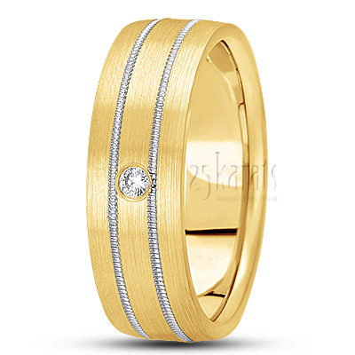 A classic milgrain design, this 7mm wide Diamond wedding band has a round shaped diamond with a burnish setting. The ring is set with 1 Round Cut Diamond, which weighs 0.04ct. The diamond is graded G in color and SI1 in clarity. The band is satin finished, with two milgrains.