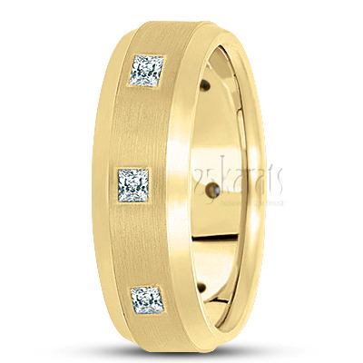 A beveled edge design, this 7mm wide Diamond wedding band has princess cut diamonds with a burnish setting. The ring is set with 8 Princess Cut Diamonds. Each diamond weighs 0.07ct, which is a total of 0.56ct. The diamonds are graded G in color and SI1 in clarity. Center of the band is satin finished. Each side is high polished. (Also available in 5, 6mm with smaller diamonds)