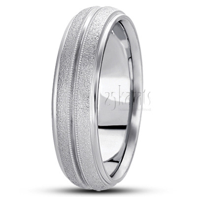 A classic design, this 7mm wide Diamond Carved wedding ring has a deep bright cut at the center, with milgrains on each side. The rest of the body is matte, and it is complete with shiny step edges. This wedding band is also available in 6mm.