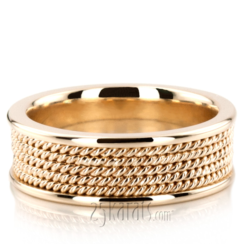 A sleek design, this 7mm wide Hand Woven wedding band has 5 rows of braids at the center, and shiny edges. The band is high polished.