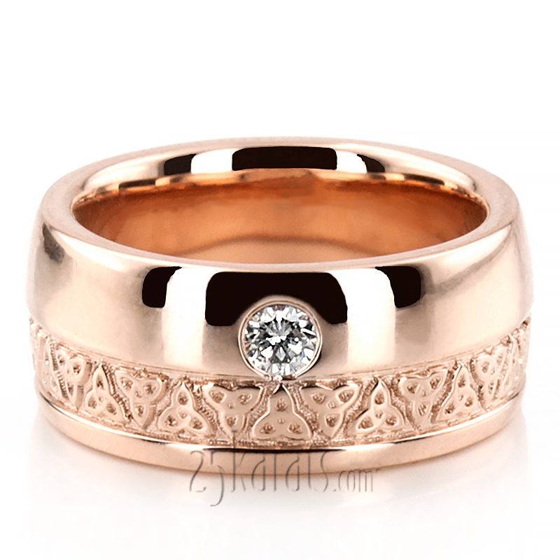 This beautifully crafted Diamond Celtic wedding ring features an off-center line of elegant triquetra symbols. It is adorned with a single, round-cut diamond weighing 0.07ct, boasting a G color grade and SI1 clarity for exquisite sparkle and clarity. The ring's band is high-polished, enhancing its sophisticated and refined appearance.