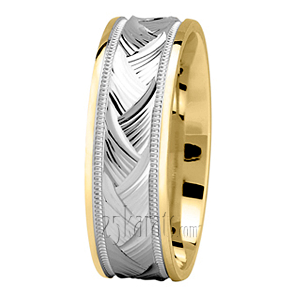 A winner! This 7mm wide Fancy Carved wedding ring has an exclusive center design consisting of intersecting diagonal lines. The band is high polished.